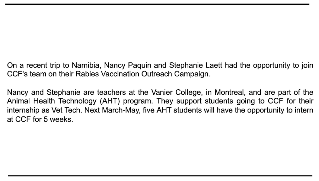 - Dr Nancy Paquin and Dr Stephanie Laett, Vanier College Animal Health Technology instructors visiting CCF to explore future pedagogical and internship opportunities for Vanier students