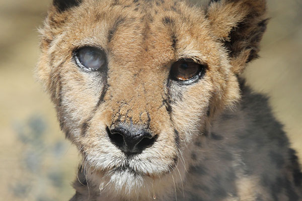 Dominic (male) was orphaned in the Khomas region of Namibia in May 2018. The Ministry of Environment Forestry and Tourism (MEFT) contacted the Cheetah Conservation Fund (CCF), and staff drove out to meet a farmer who reported that someone had dropped off a cub at her farm. The farmer had cared for the cub for about a week but became concerned when it started having health problems. Dominic was taken to a local vet for an initial assessment before being brought to CCF. At about 10-14 days old, his eyes had just opened, and he had no teeth. CCF staff prepared a nursery area for him and began feeding him a cat milk supplement every three hours. Dominic responded well to care and is now doing great.