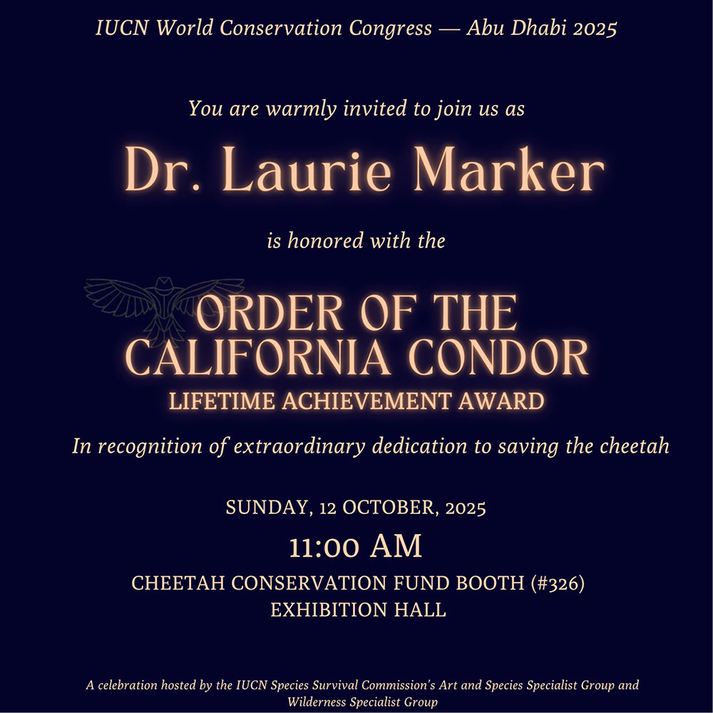 Dr. Laurie Marker, Founder and Executive Director of CCF, was honored during the event with the Order of the California Condor, presented by Vance Martin, Patricio Robles Gil, and Ramon Perez Gil of the WILD Foundation. This lifetime recognition, established by the IUCN Art and Species Specialist Group and the Wilderness Specialist Group, celebrates individuals who have devoted their lives to protecting species and wild nature. Dr. Marker was recognized alongside other leading conservationists including IFAW President Azzedine Downs, Dr. Sylvia Earle and Dr. Russell Mittermeier.