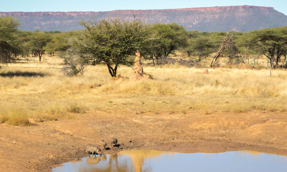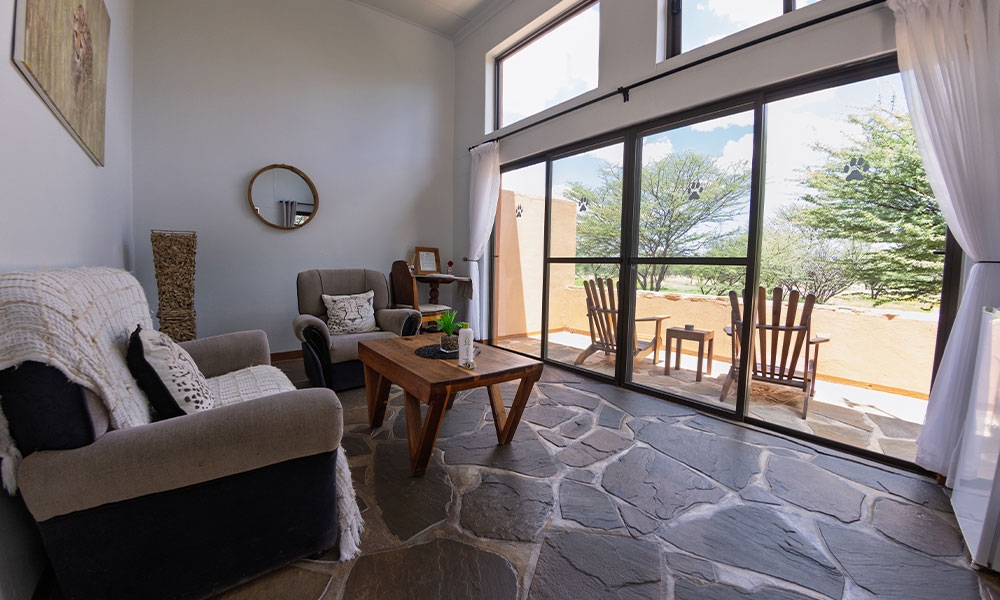 Accommodation fees include breakfast and dinner plus a 15% discount off all cheetah activities, from cheetah drives to the popular cheetah runs. Our Cheetah View Meal House offers a full service restaurant with an open-air veranda for lounging and wildlife viewing at the purpose-built waterhole. The large family room situated below the Meal House also overlooks the waterhole with similarly breathtaking views of the Waterberg Plateau in the distance.