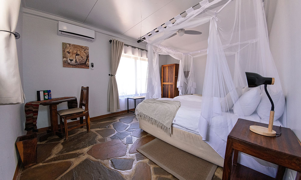 With uninterrupted views of the Waterberg Plateau, the five room Cheetah View Lodge is the ideal setting for guests to witness a world-class Field Conservation Centre at work. The two guestroom buildings are split into individual suites each with their own private entrance and porch area.