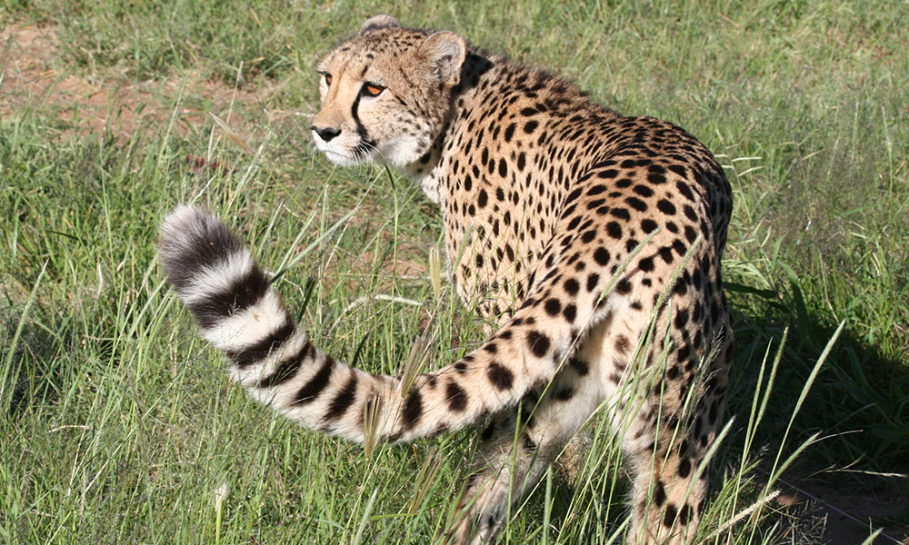 Autres caractéristiques : une petite tête, une colonne vertébrale très souple, des griffes semi-rétractiles, une longue queue épaisse et musclée qui lui sert de balancier pour garder l’équilibre lors de virages brusques pris à pleine vitesse. Il est possible également que sa queue serve de repère à ses petits qui tentent de suivre leur mère dans les hautes herbes.